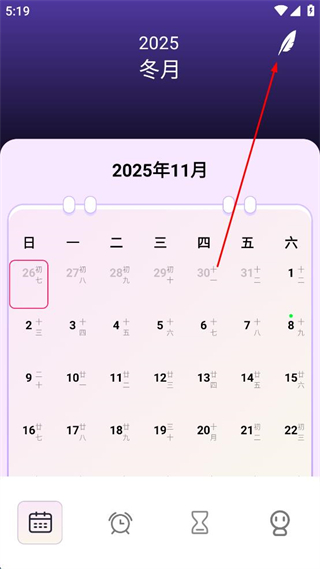 1、在日歷類軟件界面,點(diǎn)擊右上角羽毛圖標(biāo)。