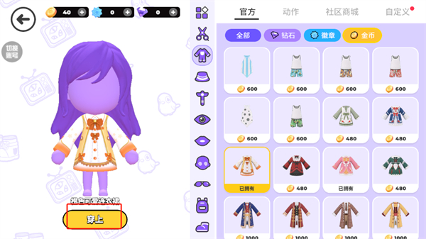 3、當(dāng)場景內(nèi)出現(xiàn)“穿上”按鈕時(shí),即意味著服飾已經(jīng)被購買成功,玩家將可以自由的進(jìn)行穿戴;