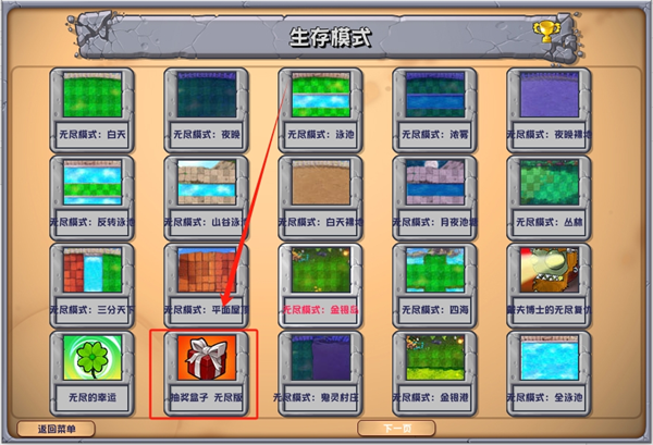 2、在生存模式中將會(huì)看到超多的迷你小游戲,在最下方找尋到抽獎(jiǎng)盒子無(wú)盡版;