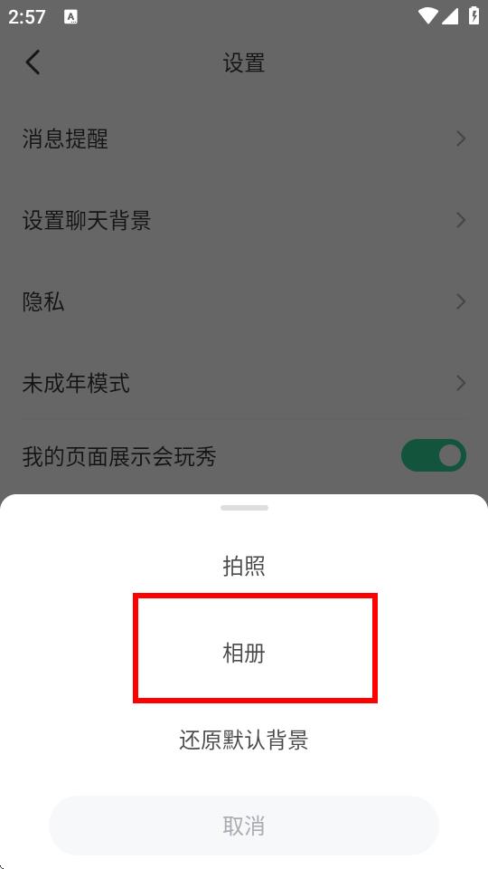 4、在彈出的選項中點擊相冊,從相冊選擇喜歡的圖片來設置為聊天背景。
