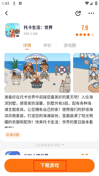 4、進(jìn)入后將會(huì)看到游戲的介紹、詳情、評(píng)價(jià)和游戲圈等信息,點(diǎn)擊下方的【下載游戲】即可高速下載游玩啦。