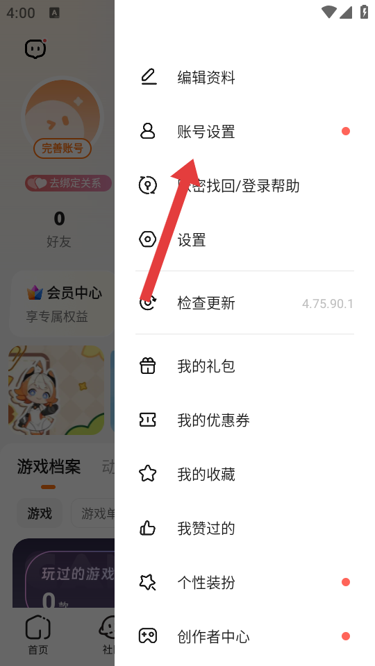 2、在側(cè)邊欄菜單中,點(diǎn)擊賬號(hào)設(shè)置選項(xiàng),進(jìn)入賬號(hào)與綁定設(shè)置的頁(yè)面。