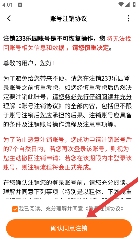 4、在賬號(hào)注銷協(xié)議頁(yè)面,勾選注銷協(xié)議后,點(diǎn)擊確認(rèn)同意注銷按鈕,完成賬號(hào)注銷申請(qǐng)。