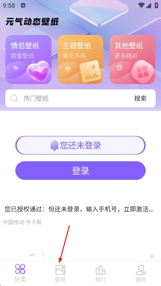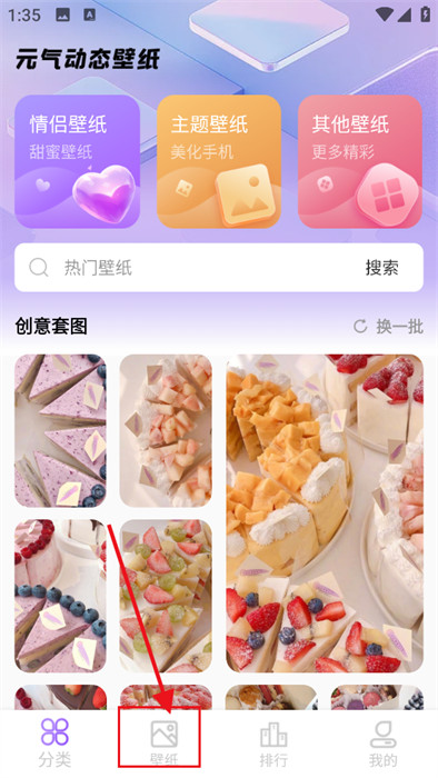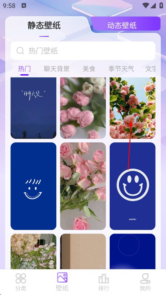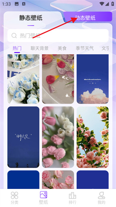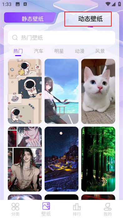1、打開元氣動態(tài)壁紙軟件后,在底部導(dǎo)航欄中點擊“壁紙”選項進入壁紙瀏覽界面,可選擇靜態(tài)或動態(tài)壁紙,還能根據(jù)分類標(biāo)簽查找喜歡的壁紙類型。