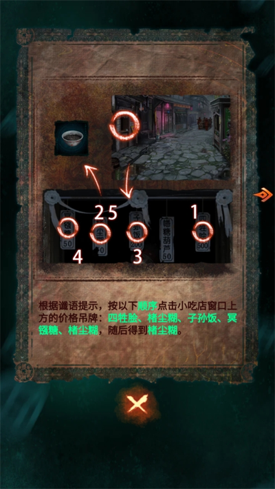 2、通過書籍我們可以看到要找到兩間口名小吃的店面并按照順序進(jìn)行點擊,我們返回找到兩間口名小吃;