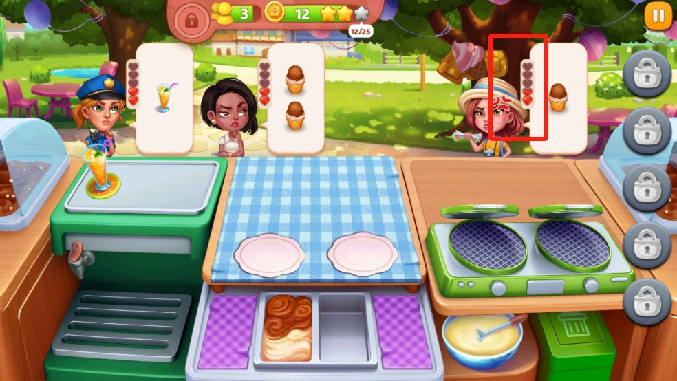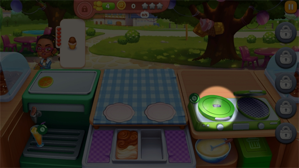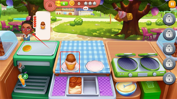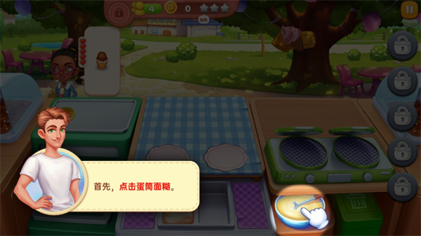 1、進(jìn)入游戲后可以看到顧客需要冰淇淋,跟隨教程點(diǎn)擊面糊放置到帶機(jī)子中;