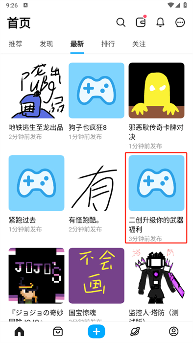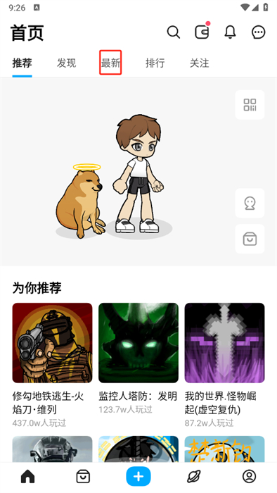 1、進入到軟件之中后,可以點擊屏幕之中的【最新】按鈕,以看看最近有什么新的游戲創(chuàng)意;
