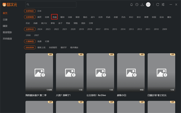 3、進(jìn)入后由于網(wǎng)絡(luò)問題封面加載速度會(huì)比較慢,我們可以直接找尋動(dòng)漫類型比如以熱血為例;
