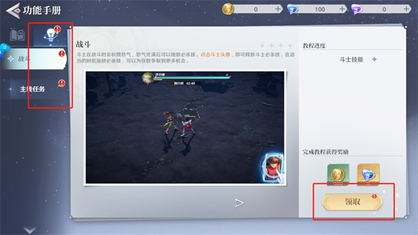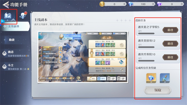 2、功能手冊中會將會看到主線副本任務(wù)的成就獎勵領(lǐng)取,在這里可以看到游戲中的副本挑戰(zhàn);