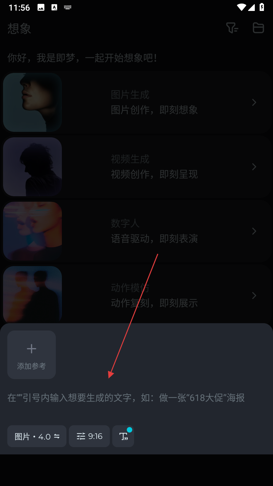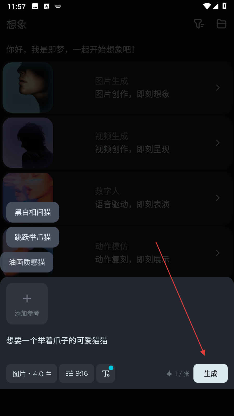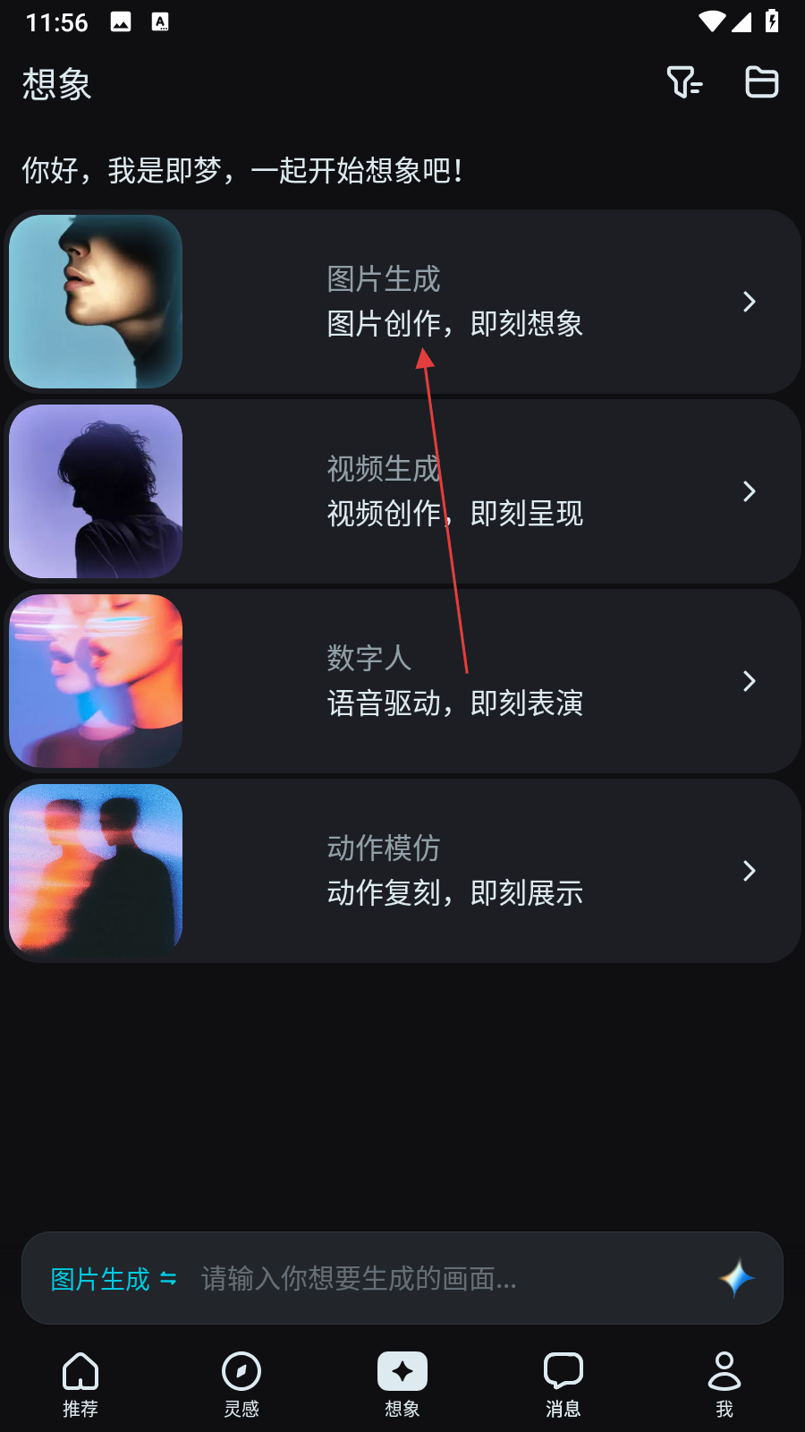 1、打開即夢AIAPP,進入想象頁面,點擊圖片生成選項,進入圖片生成界面。