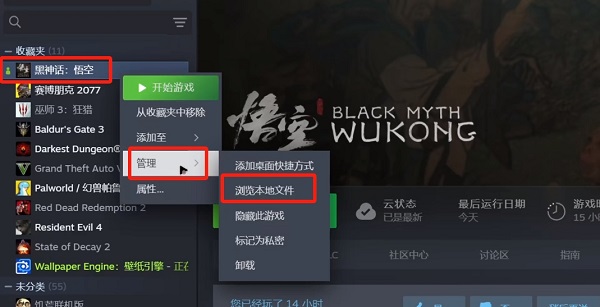 2、然后我們在Steam中找到【黑神話悟空-管理-瀏覽本地文件】,進入到黑神話悟空的根目錄中;