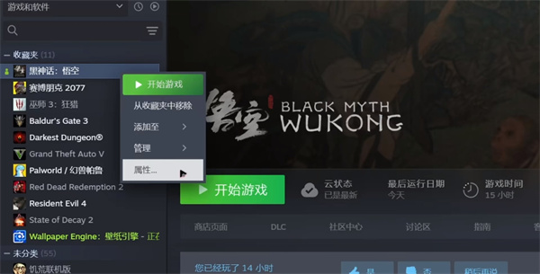 5、要啟用加載模組,就需要在Steam中右鍵黑神話悟空,點擊其中的【屬性】進入其中;