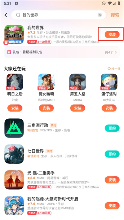 2、我們以我的世界為例,直接點(diǎn)擊安裝進(jìn)行下載就可以下載到本地中進(jìn)行游玩;