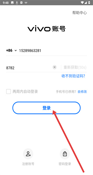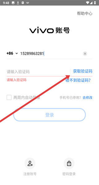 3、在跳轉(zhuǎn)至vivo賬號登錄頁面中,點(diǎn)擊輸入框填寫手機(jī)號點(diǎn)擊獲取驗(yàn)證碼按鈕。