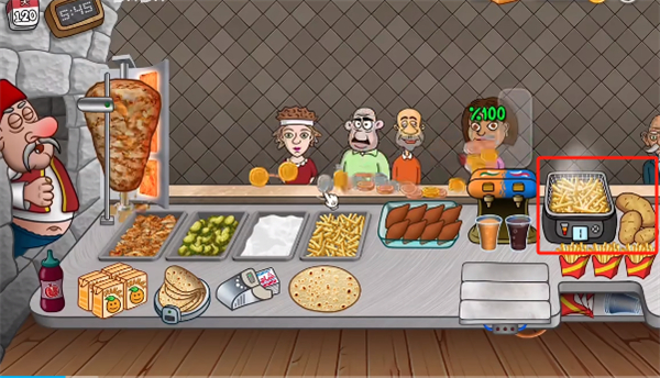 2、當(dāng)你的顧客需要炸薯?xiàng)l時(shí),可以點(diǎn)擊薯?xiàng)l機(jī)器旁邊的土豆,那樣土豆將會(huì)被切成薯?xiàng)l狀,并進(jìn)入到薯?xiàng)l機(jī)器中;