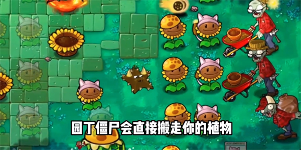 2、新出現(xiàn)的園丁僵尸更是離譜,他們會(huì)推著自己的小推車(chē)偷走第一個(gè)遇到的植物,但是失去車(chē)子速度會(huì)變慢哦;