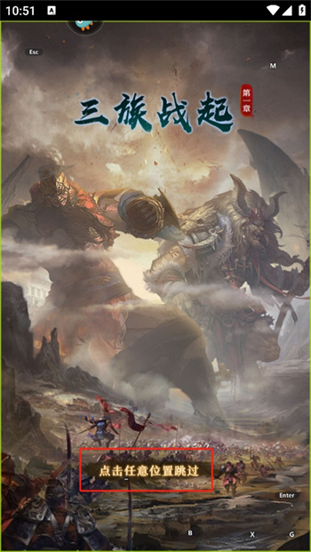 3、根據(jù)屏幕之上【點擊任意位置跳過】提示,隨意的點擊一個地方就可以正式的進入到游戲中,然后展開自己的決戰(zhàn)游戲;