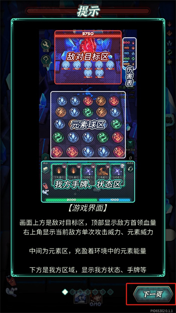 2、然后來(lái)到游戲的玩法提示界面中,點(diǎn)擊右下角的【下一頁(yè)】翻閱每一個(gè)界面中的文字描述,一步步了解這個(gè)游戲的戰(zhàn)斗內(nèi)容,快速加入這里體驗(yàn)手牌對(duì)戰(zhàn);