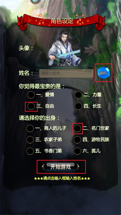 2、此時玩家將需要進(jìn)行角色的選擇,可以給自己的角色進(jìn)行名字以及屬性等的選擇,并點擊【開始游戲】;