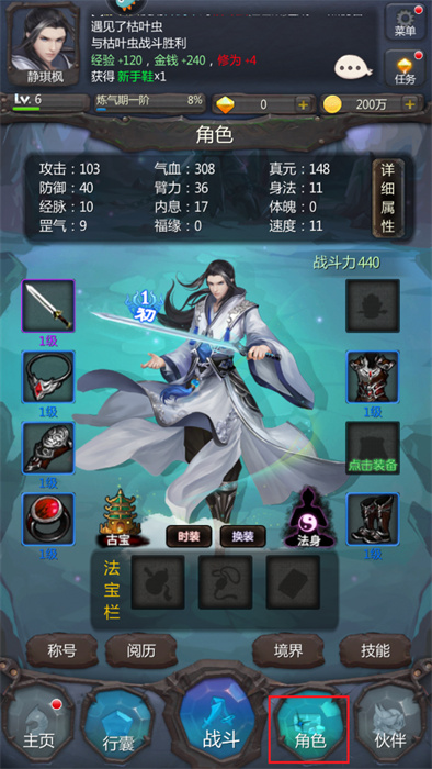5、點擊屏幕下方的【角色】按鈕來進(jìn)行角色相關(guān)信息的查看,不同的角色有著不同的屬性;
