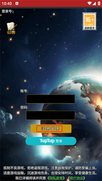 1、進(jìn)入戰(zhàn)斗之前首先需要點(diǎn)擊登錄上自己的游戲賬號(hào),可以輸入賬號(hào)與密碼然后點(diǎn)擊【注冊(cè)登錄】就可以進(jìn)入游戲中,還可以點(diǎn)擊TapTap登錄進(jìn)入自己的游戲賬號(hào)中;