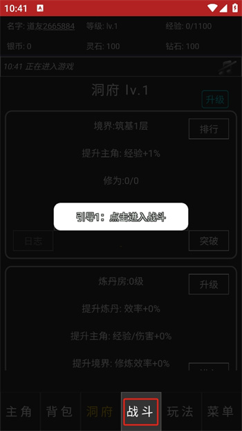 2、之后進(jìn)入到游戲中,跟隨著新手的指引進(jìn)行點(diǎn)擊,點(diǎn)擊引導(dǎo)1之下的【戰(zhàn)斗】進(jìn)入到戰(zhàn)斗對(duì)抗之中;