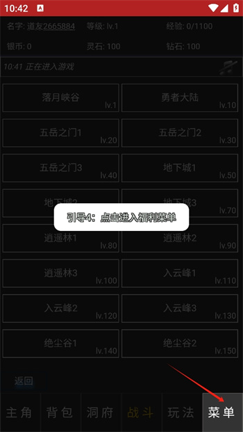 5、之后跟隨著引導(dǎo)4繼續(xù)點(diǎn)擊右下角的【菜單】,點(diǎn)擊進(jìn)入到福利菜單中,進(jìn)入到下一步的新手指引里面;
