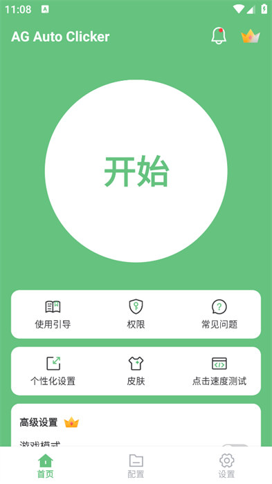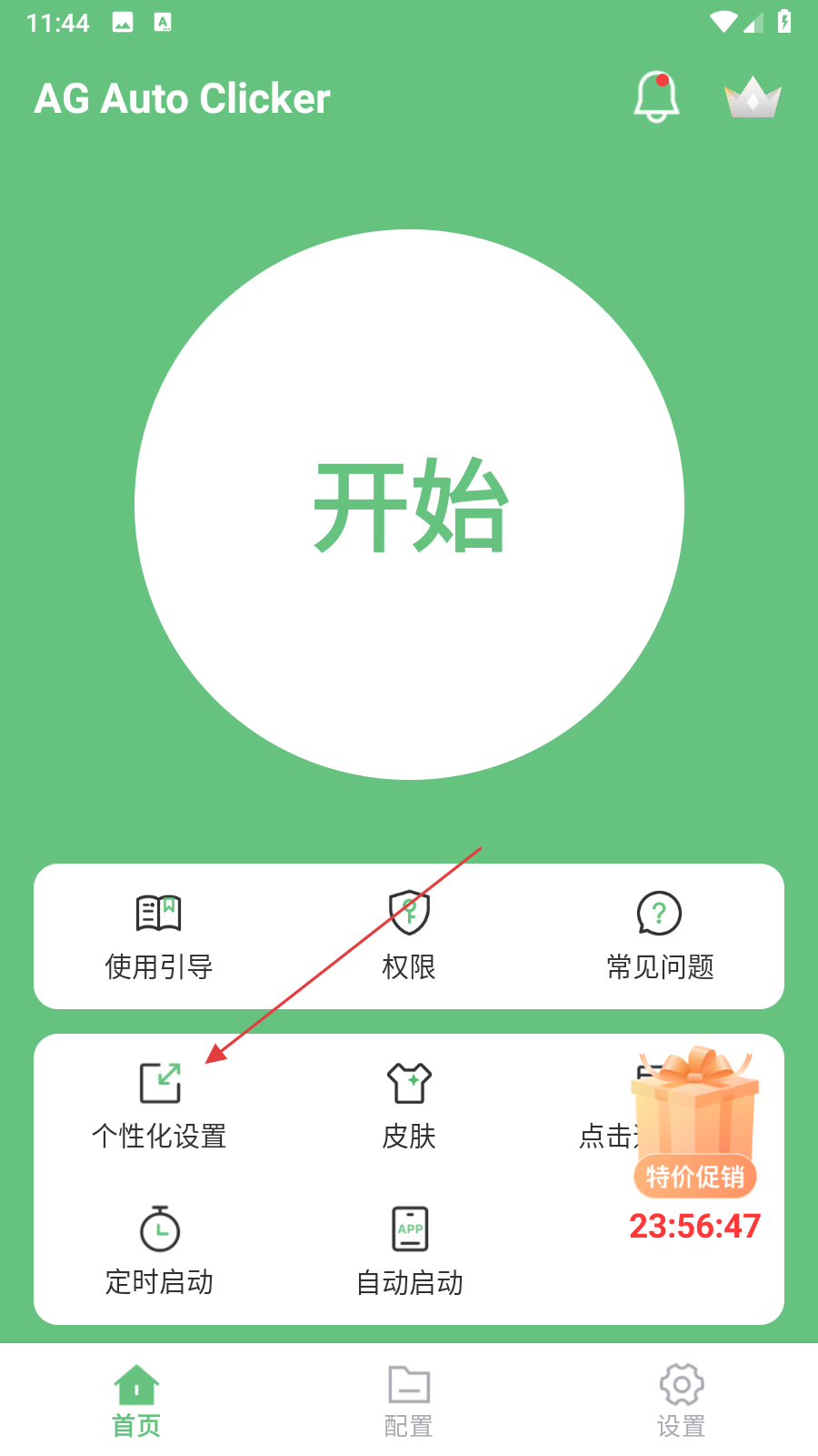 1、打開AG自動點(diǎn)擊器應(yīng)用,在首頁點(diǎn)擊個性化設(shè)置選項(xiàng),進(jìn)入個性化設(shè)置界面。