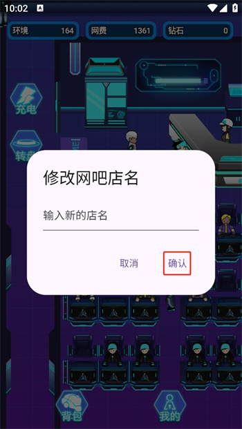 4、可以為自己網(wǎng)吧起一個(gè)獨(dú)特的店鋪名字,在橫線上方輸入自己的新店面,然后點(diǎn)擊下角的確認(rèn)就可以為自己店鋪起一個(gè)獨(dú)有的名字了,展開全新的游戲模擬經(jīng)營(yíng)過(guò)程;