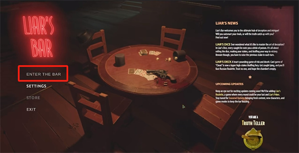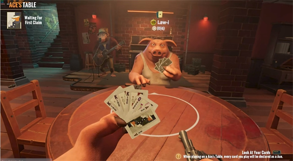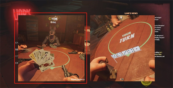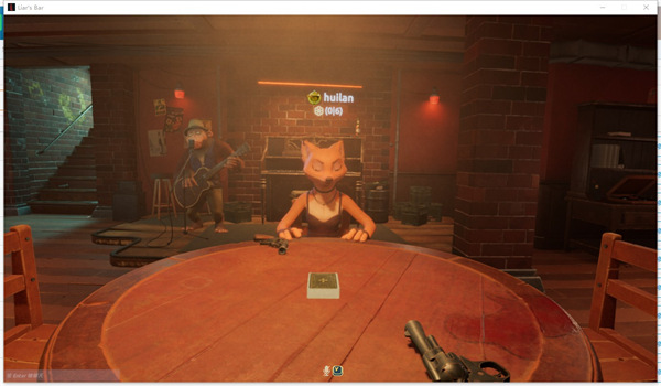 騙子酒館Liar's Bar是一款非常有趣的心理博弈游戲,類似國內的撲克牌玩法,只不過充滿了勾心斗角,你將和四個動物朋友在一個牌桌上去進行比拼,猜中對方的牌是什么,這樣就可以讓對方亂了陣腳,在昏暗的酒吧中,開啟第一人稱的精彩對決,每個人每局都會有五張手牌,需要靠蒙和唬讓自己通過,如果被人開牌,且跟需要放的牌不一致,那么就需要使用自己的左輪對著自己開槍,但是左輪中只有一發(fā)子彈,也就是說你如果運氣好,還可以繼續(xù)牌桌對決,看你的運氣和膽量了。