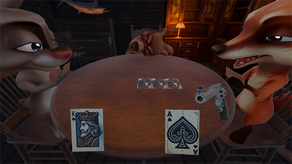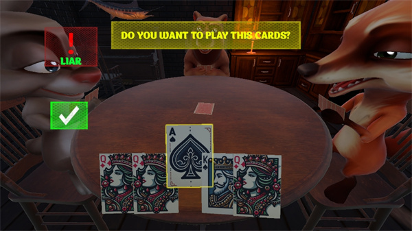騙子酒館仿制版為各位玩家?guī)?lái)和端游一樣的體驗(yàn),但是缺少了聯(lián)機(jī)功能,只能和機(jī)器人去進(jìn)行對(duì)戰(zhàn),但是玩法什么的都是一樣的,可以帶來(lái)最驚心動(dòng)魄的對(duì)決,需要考驗(yàn)?zāi)愕男睦沓惺苣芰?,需要在別人面前不露怯,正常的出牌,不要暴漏自己出的什么牌,這樣別人就看不出來(lái),只能憑借自己的直覺去進(jìn)行考慮,要不要翻你的牌,就算翻了,我們還有機(jī)會(huì),因?yàn)樽筝喼兄挥幸活w子彈,如果不是運(yùn)氣太差,應(yīng)該不至于第一槍就擊發(fā),所以可以放心的體驗(yàn)。