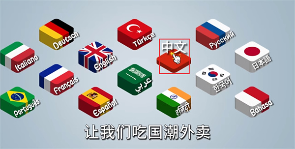 1、點擊屏幕之中的【中文】按鈕,以進入到制作國潮外賣的世界;