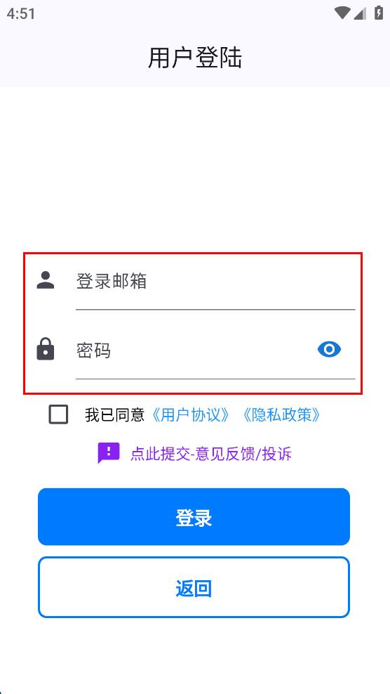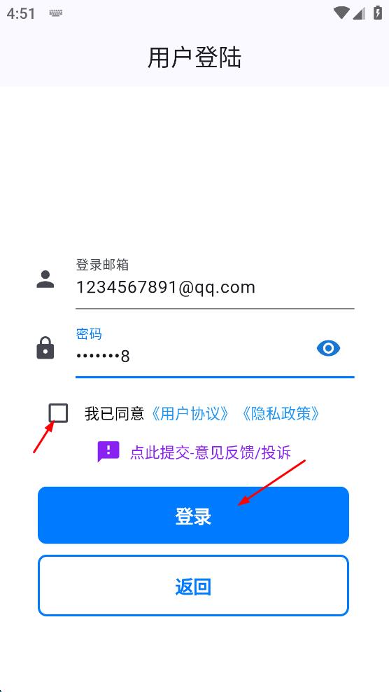 4、輸入完郵箱和密碼后,勾選我已同意用戶協(xié)議,隱私政策選項(xiàng),然后點(diǎn)擊“登錄”按鈕,完成登錄操作。