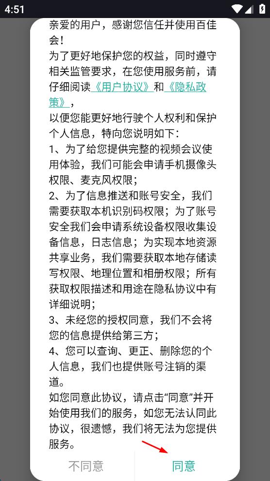 1、打開百佳會應(yīng)用,會出現(xiàn)包含用戶協(xié)議和隱私政策說明的頁面,仔細(xì)閱讀相關(guān)內(nèi)容后,點(diǎn)擊“同意”按鈕,進(jìn)入后續(xù)操作界面。