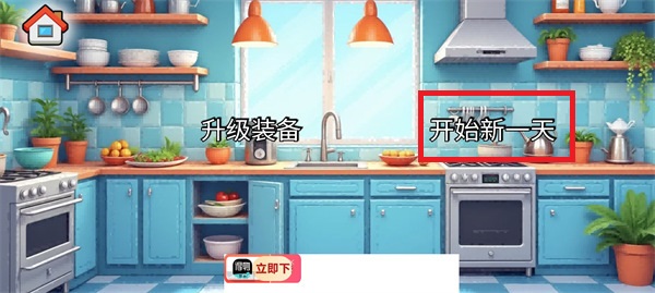 3、進(jìn)入廚房只有兩個選項,一個升級裝備,但是現(xiàn)在還沒錢升級,只能點擊【開啟新一天】去接待顧客賺錢;
