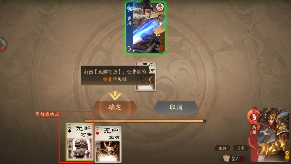 2、在戰(zhàn)斗中不同的卡牌還有獨(dú)特的技能,對(duì)方如果使用了錦囊牌可以利用無懈可擊精囊讓對(duì)方失效;