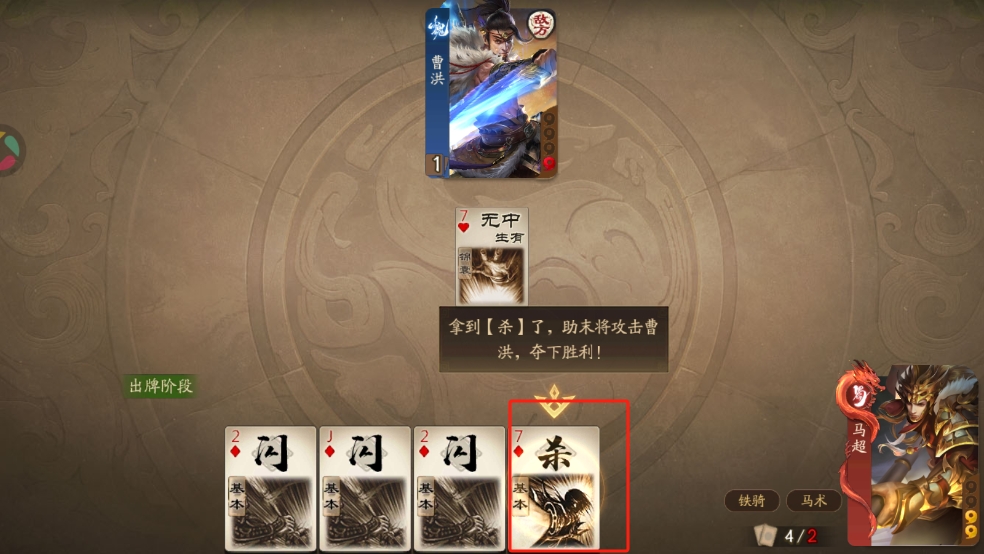 4、如果隨機(jī)摸出來的卡牌會(huì)有殺的攻擊牌,就可以直接點(diǎn)擊殺對(duì)對(duì)方進(jìn)行拿給攻擊,最終可以反敗為勝。