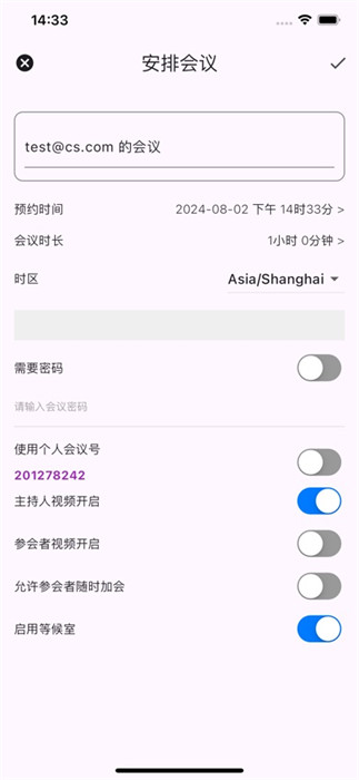 4、如果需要提前安排會議,還能設(shè)置密碼和預(yù)計(jì)的會議時長,并批量發(fā)送給參加會議的用戶;