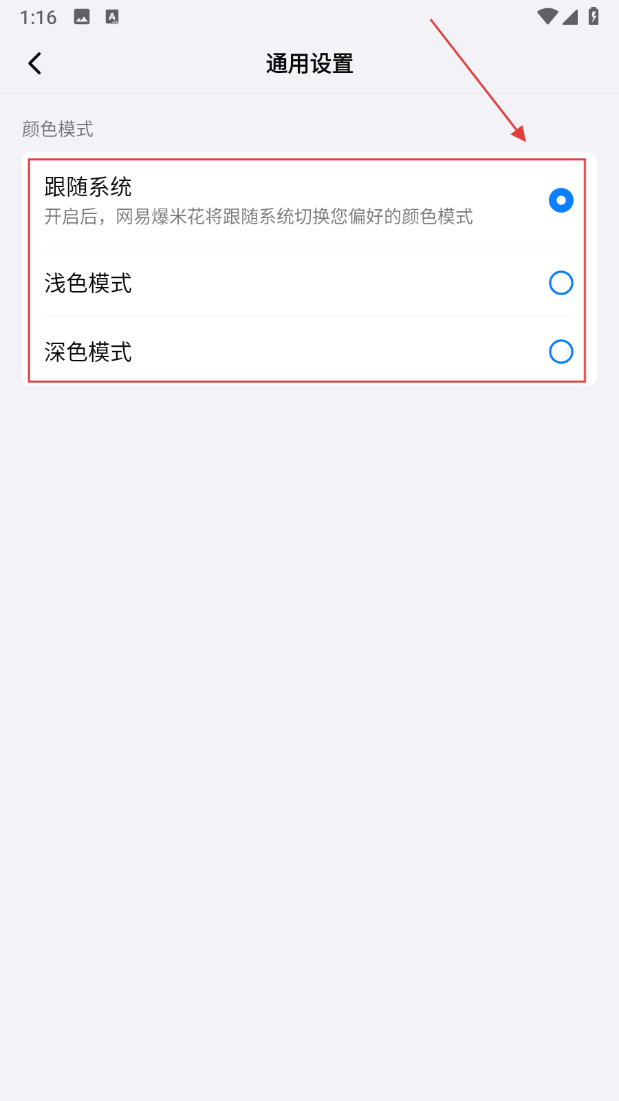 4、在通用設(shè)置頁面里,找到顏色模式設(shè)置區(qū)域,點擊對應(yīng)選項即可完成顏色模式的切換。