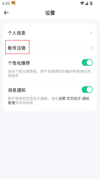 3、進(jìn)入設(shè)置界面后即可看到【賬號(hào)注銷(xiāo)】選項(xiàng),點(diǎn)擊該選項(xiàng)進(jìn)入注銷(xiāo)界面;