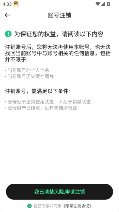 4、進(jìn)入賬號(hào)注銷(xiāo)界面,在這里可以查看賬號(hào)注銷(xiāo)的注意事項(xiàng),確認(rèn)沒(méi)問(wèn)題后點(diǎn)擊下方【我已清楚風(fēng)險(xiǎn),申請(qǐng)注銷(xiāo)】選項(xiàng)即可。
