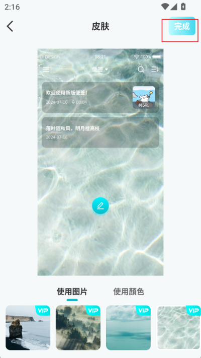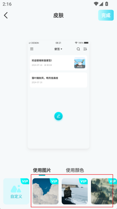 4、選擇自己心儀的背景圖片后,點(diǎn)擊右上角的【完成】選項(xiàng)即可更換,不過該功能需要用戶開啟會員特權(quán)。
