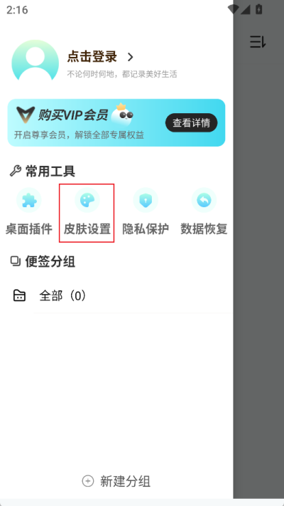 2、點(diǎn)擊后彈出側(cè)邊欄選項(xiàng),在里面找到【皮膚設(shè)置】選項(xiàng)并點(diǎn)擊;