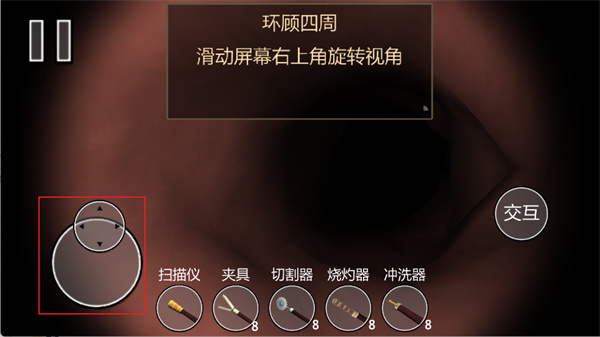 6、進(jìn)入腸道后,左側(cè)是輪盤按鈕,負(fù)責(zé)前進(jìn)和后退,而中間則是可以使用的道具;