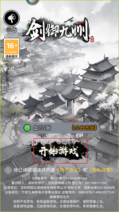 1、首先打開下載好的劍御九州,進(jìn)入游戲后登錄自己的游戲賬號(hào),選擇游戲大區(qū),點(diǎn)擊【開始游戲】;