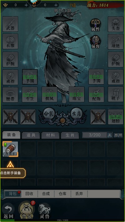 3、進(jìn)入包裹功能后,可以在里面查看自己的裝備、道具、材料以及生肖物品,點(diǎn)擊【新手裝備】;