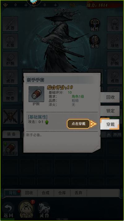 4、點(diǎn)擊后會(huì)彈出裝備的詳情介紹以及其他功能選項(xiàng),我們點(diǎn)擊【穿戴】;