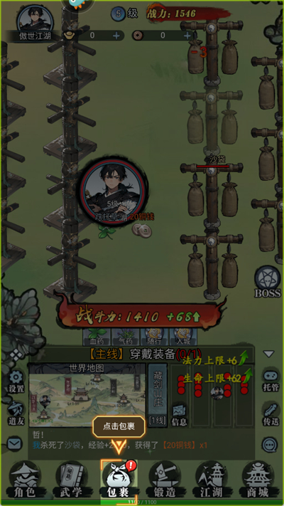 2、進(jìn)入游戲后跟隨新手引導(dǎo)點(diǎn)擊,我們先點(diǎn)擊【包裹】選項(xiàng)查看自己的背包;