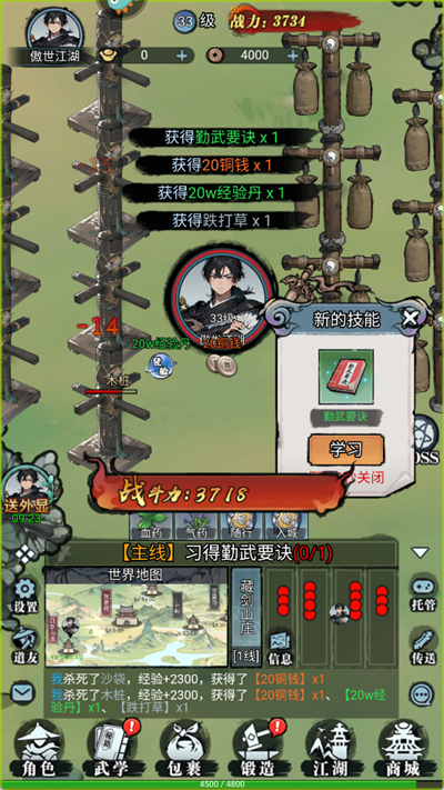 6、后續(xù)玩家可以查看主線任務(wù)要求,跟著主線任務(wù)去完成相應(yīng)挑戰(zhàn)即可快速升級(jí),還有相應(yīng)的武學(xué)技能書贈(zèng)送,點(diǎn)擊學(xué)習(xí)按鈕可以學(xué)習(xí)新的技能。