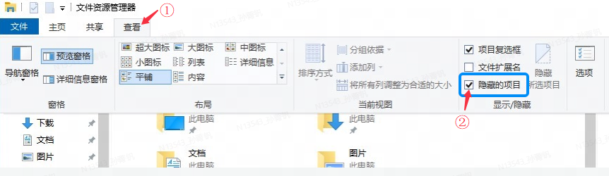 ②第二步,打開(kāi)“文件資源管理器”后,選擇“查看“,并勾選”隱藏的項(xiàng)目“。